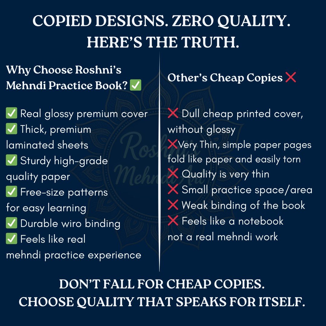 Thank you, Roshini’s Mehandi Art, for the exceptional service! The designs were beautiful and delivered with efficiency. Your practice book is a valuable resource for beginners, providing the same designs and allowing for fast improvement. It’s truly a one-time investment that simplifies the learning process and yields superb results. I highly recommend your practice book to all beginners; there’s no need to look elsewhere. A well-deserved 5-star rating! 🫶🏽
